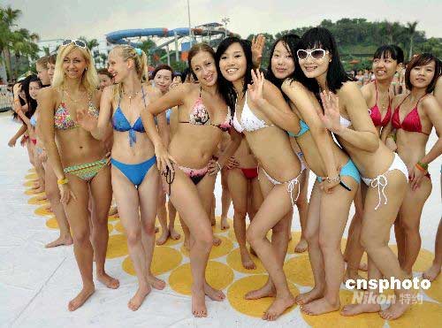 6月15日,充滿了東方魅力的1500名比基尼女郎在廣州長(zhǎng)隆水上樂園挑戰(zhàn)2007年在澳大利亞黃金海岸的1010位比基尼女郎合照紀(jì)錄。1500名比基尼女郎齊心協(xié)力通過集體的行為藝術(shù),擺出大型的奧運(yùn)五環(huán)造型,用自己的力量支持北京奧運(yùn)!中新社發(fā) 劉衛(wèi)勇 攝
