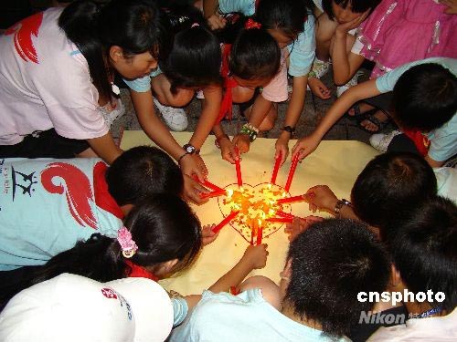 6月15日晚上,89名參加“愛心呵護、陽光行動”活動的在四川地震中的失親孩子,用紅色蠟燭油在白色的紙上作心型字,寄托對海南的眷戀和相思。16日他們將告別美麗的海南島返回四川老家。中新社發 付美斌 攝