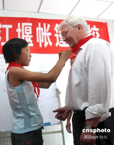 帳篷小學的孩子為施泰因邁爾獻上紅領巾。中新社發 黃榮 攝