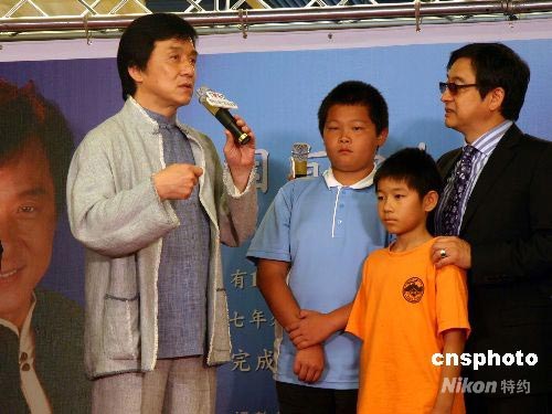 6月18日,應TVBS關懷臺灣文教基金會邀請,成龍出席“寶貝我們的希望——成龍代言募款記者會”。圖為成龍與來自臺東、云林、臺北等縣的貧苦學童面對面溝通。中新社發 許曉青 攝