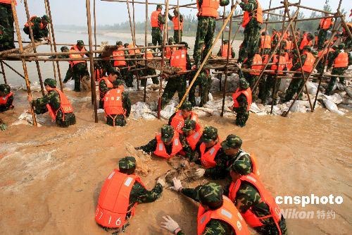 6月18日,山東省軍區(qū)和濟(jì)南警備區(qū)在濟(jì)南西郊玉清湖附近黃河大堤舉行大型防汛搶險(xiǎn)演練。來(lái)自濟(jì)南市的10支民兵預(yù)備役部隊(duì)、黃河專(zhuān)業(yè)搶險(xiǎn)隊(duì)等共1300余名隊(duì)員演練了水情偵察、封堵決口、爆破分洪、管涌搶護(hù)、堤壩搶護(hù)、緊急營(yíng)救、搶筑子堤等七項(xiàng)防汛搶險(xiǎn)科目。中新社發(fā) 周青先 攝