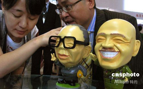 6月19日,“2008北京國際旅游博覽會”在北京展覽館開幕,臺灣桃園縣與民間觀光旅游團展臺引人注目。圖為臺灣桃園觀光產業促進會副召集人、桃園縣觀光行銷處處長陳國君(右),邊展示“兩蔣Q版公仔”,邊向北京媒體推介桃園縣旅游。中新社發 鄒憲 攝