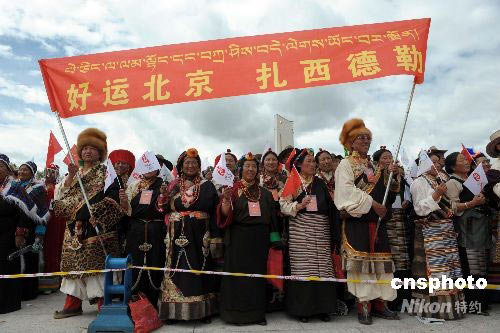 圖:藏族民眾高舉標(biāo)語(yǔ)祝福北京奧運(yùn)