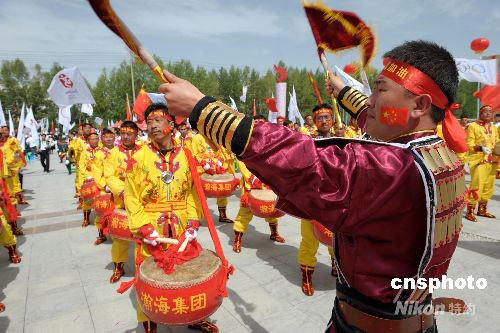 圖:格爾木鼓手擂鼓迎圣火