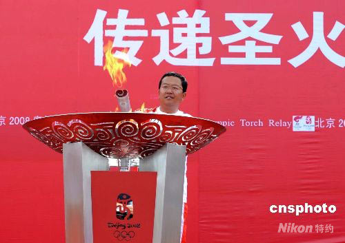 6月22日10時42分,末棒火炬手——“全國十大杰出青年”李小松在格爾木中心廣場點燃圣火盆,北京奧運火炬接力格爾木站傳遞活動圓滿結束。中新社發 廖攀 攝