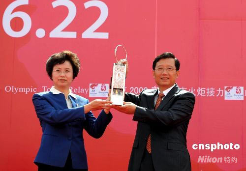 6月22日,在奧運(yùn)圣火青海格爾木傳遞結(jié)束儀式上,中共青海省委書記強(qiáng)衛(wèi)(右)和青海省省長(zhǎng)宋秀巖(左)共同展示奧運(yùn)圣火火種燈。中新社發(fā) 廖攀 攝