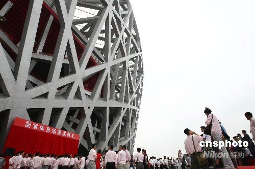 6月28日,國家體育場(“鳥巢”)落成典禮在北京舉行。國家體育場“鳥巢”系第29屆夏季奧運會主體育場,位于奧林匹克公園內,占地21.4公頃,建筑面積25.8萬平方米,南北長333米,東西寬298米,高68米,賽時坐席9.1萬個,是目前世界上跨度最大的鋼結構體育建筑之一。 中新社發 盛佳鵬 攝