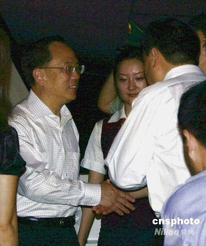 6月27日晚9點55分,香港特首曾蔭權一行乘坐CA428航班抵達成都雙流國際機場,28日將與澳門特首何厚鏵一起前往彭州和都江堰看望災民及考察災后重建情況。中新社發 黃永莉 攝