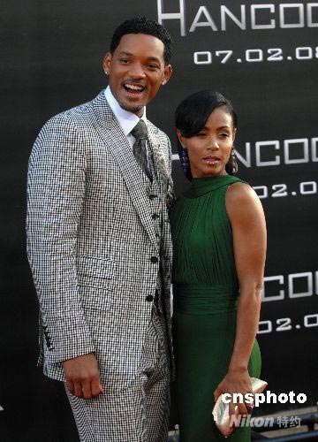 圖為《全民超人》男主角漢考克的扮演者好萊塢著名影星威爾·史密斯(Will Smith)與妻子賈達·萍克·史密斯一起出席首映禮。中新社發 張煒 攝