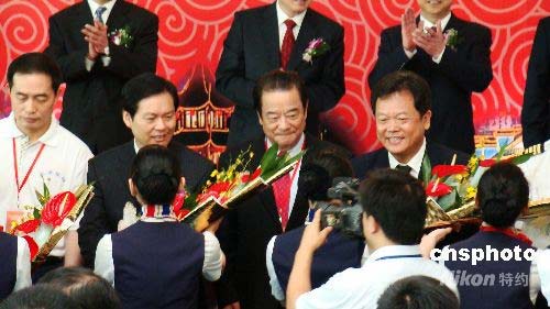 7月4日早晨七點(diǎn),兩岸周末包機(jī)南京首航暨大陸居民赴臺旅游首發(fā)儀式在南京祿口國際機(jī)場隆重舉行。圖為空乘人員向乘客代表等獻(xiàn)花。中新社發(fā) 丁梅 攝