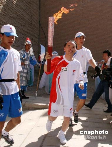 韓國籍第202棒火炬手李賢求在嘉峪關(guān)關(guān)城內(nèi)進(jìn)行傳遞。中新社發(fā) 周兆軍 攝