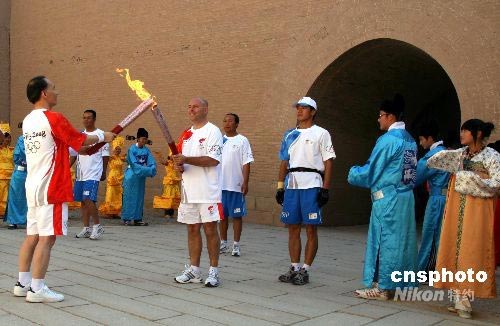 韓國籍火炬手李賢求(左一)和德國籍火炬手羅曼在嘉峪關關城內交接火炬。 中新社發 周兆軍 攝