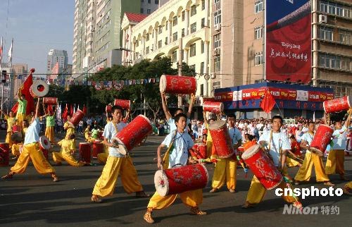 圖:蘭州威風鑼鼓為奧運火炬傳遞助威