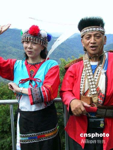 圖中左為身著鄒族傳統服飾的大陸游客,右為當地鄒族人士。中新社發 徐長安 攝