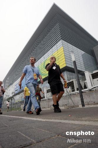圖為記者走過國際廣播中心(IBC)大樓。IBC是采訪報道奧運會的廣播電視媒體人員工作總部,總建筑面積14萬平方米,是奧運歷史上最大的國際廣播中心。中新社發 杜洋 攝
