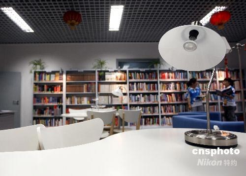 7月8日,北京2008年奧運會主新聞中心(MPC)正式開放,內部的中小型圖書館可讓疲憊的記者放松一下。中新社發 杜洋 攝