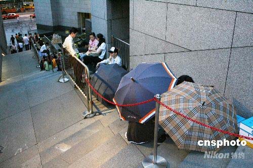 七月十四日,離中銀香港發(fā)行面額二十元港幣的奧運(yùn)紀(jì)念鈔票還有兩天時間,香港中銀大廈外已有不少市民排隊等候,隊伍中不乏傘陣和帳篷。中新社發(fā) 武仲林 攝