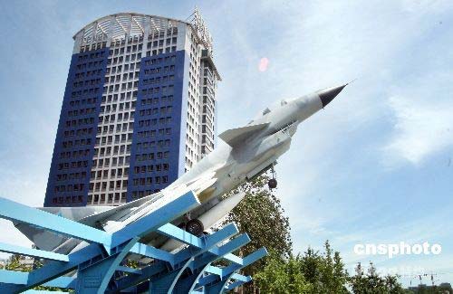 2008年7月17日,殲十飛機景觀工程在中國航空工業第一集團公司總部前“一航花園”隆重揭幕。這標志著殲十飛機景觀工程正式落戶朝陽CBD。這架殲十是完全根據真機的一比一高仿模型,機上細節分毫畢現。殲十作出大仰角爬升的姿態,翼下掛有國產雷石6滑翔制導炸彈、霹靂9C近距格斗空空導彈及霹靂12中距空空導彈。中新社發 博芽影像 攝