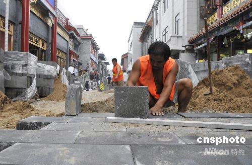 前門大柵欄步行街緊鑼密鼓的開始了道路鋪設作業。屆時,古老的大柵欄步行街將煥然一新面向海內外游客。中新社發 王宇婷 攝