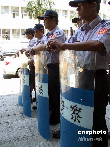 7月21日上午,臺北地方法院開庭審理臺灣地區(qū)前領(lǐng)導(dǎo)人陳水扁等被控誹謗案,陳水扁首度以被告身份到庭應(yīng)訊。臺北市警方動員多名警力會同法警維持場外秩序。中新社發(fā) 徐長安 攝