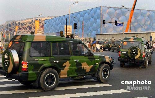 圖:大批軍車進駐北京奧運會主場館區域
