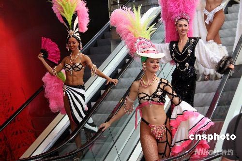 7月24日下午,法國巴黎著名的麗都夜總會的舞娘在巴黎老佛爺百貨男裝館,為游人和顧客獻上風情萬種的火辣演出,為巴黎老佛爺百貨公司在今夏七月推出的特別促銷活動助陣。中新社發 王倩 攝