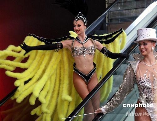 法國巴黎著名的麗都夜總會的舞娘在巴黎老佛爺百貨男裝館,為游人和顧客獻上風情萬種的火辣演出。中新社發 王倩 攝
