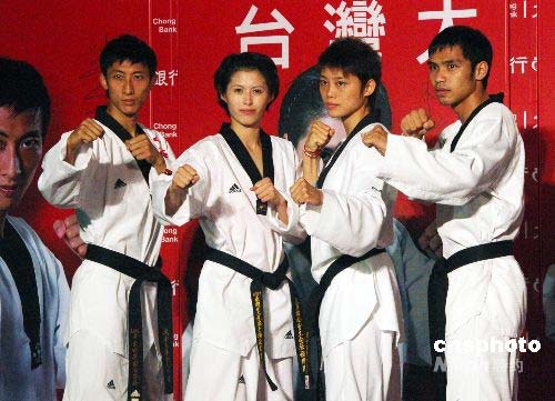 中華臺(tái)北隊(duì)選手們目前正在高雄左營(yíng)訓(xùn)練中心加緊訓(xùn)練,準(zhǔn)備以最好的狀態(tài),備戰(zhàn)北京奧運(yùn)。圖為中華臺(tái)北跆拳道隊(duì)派出4名男女選手參賽,包括上屆奧運(yùn)冠軍朱木炎(右起)、楊淑君、蘇麗文和宋玉麒。據(jù)表示,4名選手都有奪牌希望。中新社發(fā) 黃少華 攝