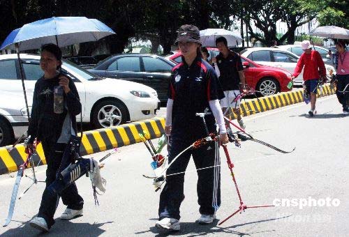 圖為中午,射箭運動員們正結束訓練,返回休息。中新社發 黃少華 攝