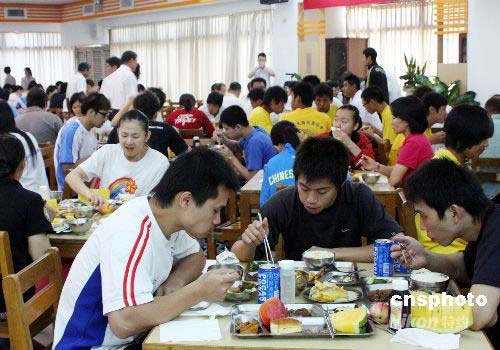 圖為運動員餐廳內,選手們正享美食,有燉牛肉、蒸雞蛋、炒時蔬,還有各樣水果,中西餐兼備,葷素搭配,花樣齊全。中新社發 黃少華 攝