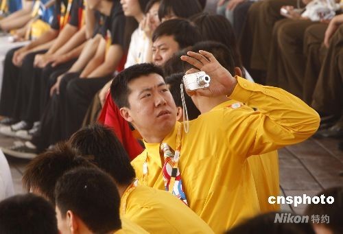 7月27日,北京奧運村正式開村,中國籃球隊隊員王治郅隨身攜帶了一部照相機,在開村儀式上四處捕捉有趣的畫面留念。中新社發 杜洋 攝
