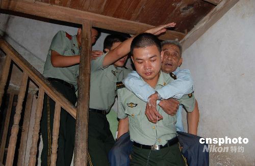 七月二十八日,隨著臺風“鳳凰”逼近福建沿海,駐守福建沿海一線的邊防官兵正全力準備,防抗臺風襲擊。圖為福建福清江陰鎮東霄村的一棟危房中,當地邊防派出所官兵把一行動不便的老伯轉移到安全地帶。中新社發 朱明海 攝