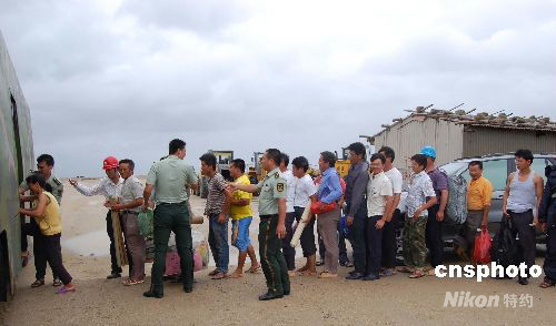 圖為邊防官兵冒著風雨用車輛將在福州新港國際碼頭施工的一百六十余位工人迅速轉移至安全地帶。中新社發 朱明海 攝