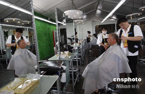 7月29日,入駐北京奧運村的村民,在美容區理發。 中新社發 杜洋 攝