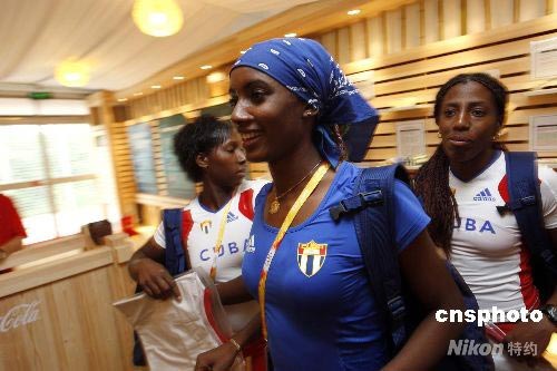 7月29日,來自古巴的女運動員在北京奧運村的紀念章交換中心參觀。中新社發 杜洋 攝