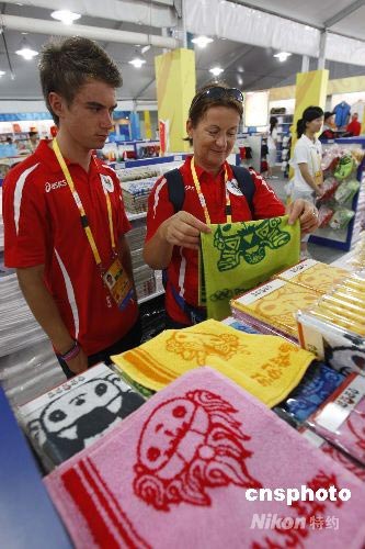 7月29日,北京奧運村購物區,來自波蘭的選手在挑選帶有“福娃”圖案的毛巾。中新社發 杜洋 攝