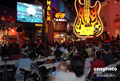 當地時間8月8日晚,上千名當地市民和游客聚集在好萊塢環球影城步行街,觀看北京奧運會開幕式盛況,現場不時傳出掌聲和驚呼聲。中新社發 張煒 攝