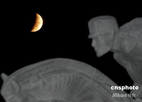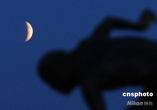 圖為8月17日4時23分在大連星海廣場拍攝的月偏食。中新社發 劉德斌 攝