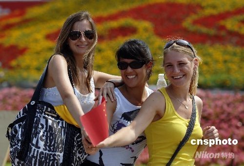 8月18日,北京晴空萬里,三位外國靚女在天安門廣場留影。中新社發 王東明 攝