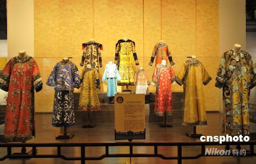 8月21日,北京故宮博物院的午門城樓展廳向游客展示了真品清朝皇家服飾,103件“天朝衣冠”集體亮相。本次展覽蘊納著深邃而多元的中國清代文化內(nèi)涵,講述著文明古國中國,賦予衣冠以明禮儀,辨尊卑的政治功能。圖為中國清代皇帝家庭著裝場景。中新社發(fā) 王宇婷 攝