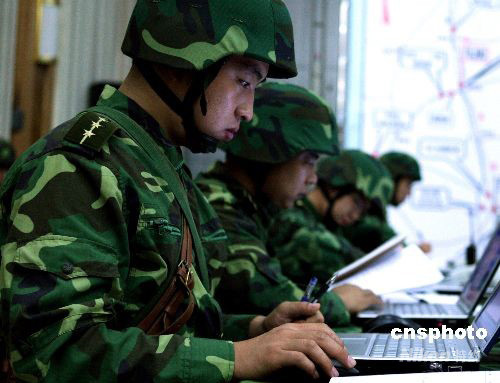 中國人民解放軍“勵兵--2008”演練8月26日拉開帷幕。當日上午濟南軍區某機械化步兵旅指揮機關向所屬部隊下達了進入戰備狀態命令,部隊迅速進入戰位嚴整以待,戰備狀態將隨時升級。中新社發 宋吉河 攝