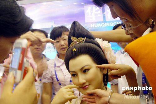 八月二十六日,仿真硅像“楊貴妃”吸引中外客商。當日,第五屆中國河南國際投資貿易洽談會在鄭州揭幕,來自美國、英國、德國、韓國、日本等七十多個國家和地區的一萬兩千余客商與會。中新社發 李志全 攝
