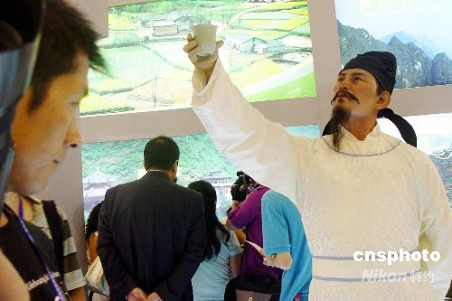 八月二十六日,“詩仙李白”把酒迎中外客商。當日,第五屆中國河南國際投資貿易洽談會在鄭州揭幕,來自美國、英國、德國、韓國、日本等七十多個國家和地區的一萬兩千余客商與會。中新社發 李志全 攝