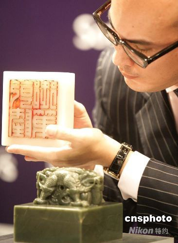 香港蘇富比拍賣行將于2008年10月8日舉行“中國瓷器及工藝品秋季拍賣會”,8月26日舉行媒體預展,圖為展示的乾隆帝御寶交龍鈕《乾隆御筆》白玉璽,預料成交價超過五千萬港元。中新社發(fā) 張勤 攝