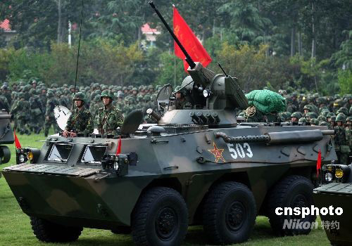 中國人民解放軍“礪兵--2008”演練8月26日拉開帷幕。當日下午濟南軍區某機械化步兵旅參戰部隊,火速集結,進入緊張戰備狀態。解放軍濟南軍區這支機械化步兵部隊與北京軍區一支數字化部隊舉行的這次跨軍區聯合實兵對抗演練,是雙方在為期一個月內進行現代條件下“背靠背”的立體化攻防演練,攻擊與反殲雙方將根據作戰任務和“情報”實施作戰計劃,以磨練部隊的戰斗能力。中新社發 宋吉河 攝