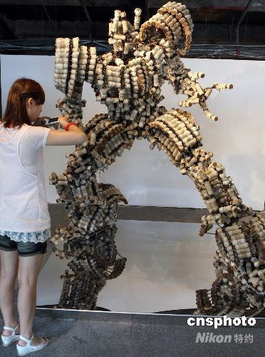 9月9日,上海雙年展國際學生展在創智天地拉開帷幕,國際學生展歷來是上海雙年展的主要藝術活動之一,本次展覽吸引了中外40余所一流設計院校前來參展。圖為一個由紡織廠廢棄物件組成的“變形金剛”吸引參觀者。中新社發 湯彥俊 攝