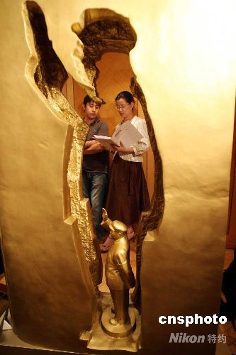 九月十日,香港國際藝展公司向傳媒展示雕塑家任思鴻的銅雕塑“空像”。該公司主辦的 “2008香港國際古玩及藝術品博覽會”將在十月四日至七日在會展中心舉行。中新社發 洪少葵 攝