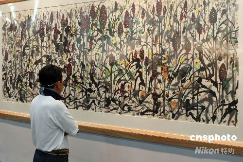 9月10日,2008上海藝術(shù)博覽會開幕。本屆藝博會吸引了來自中國、美國、法國等20個國家的140余家優(yōu)秀畫廊前來參展。圖為吳冠中代表作《高粱》吸引參觀者。中新社發(fā) 湯彥俊 攝