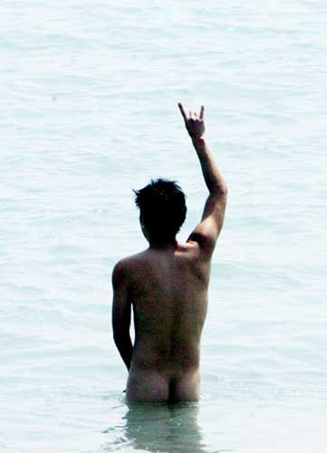 臺灣電影“海角七號”票房十八日將破億元(新臺幣),男主角范逸臣在拍片場景之一的墾丁海邊,履行海里裸泳慶功諾言。