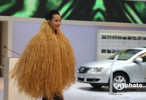 第11屆成都國際車展向媒體開放,一美女車模著“稻草”裝現身。 中新社發(fā) 霍潺 攝